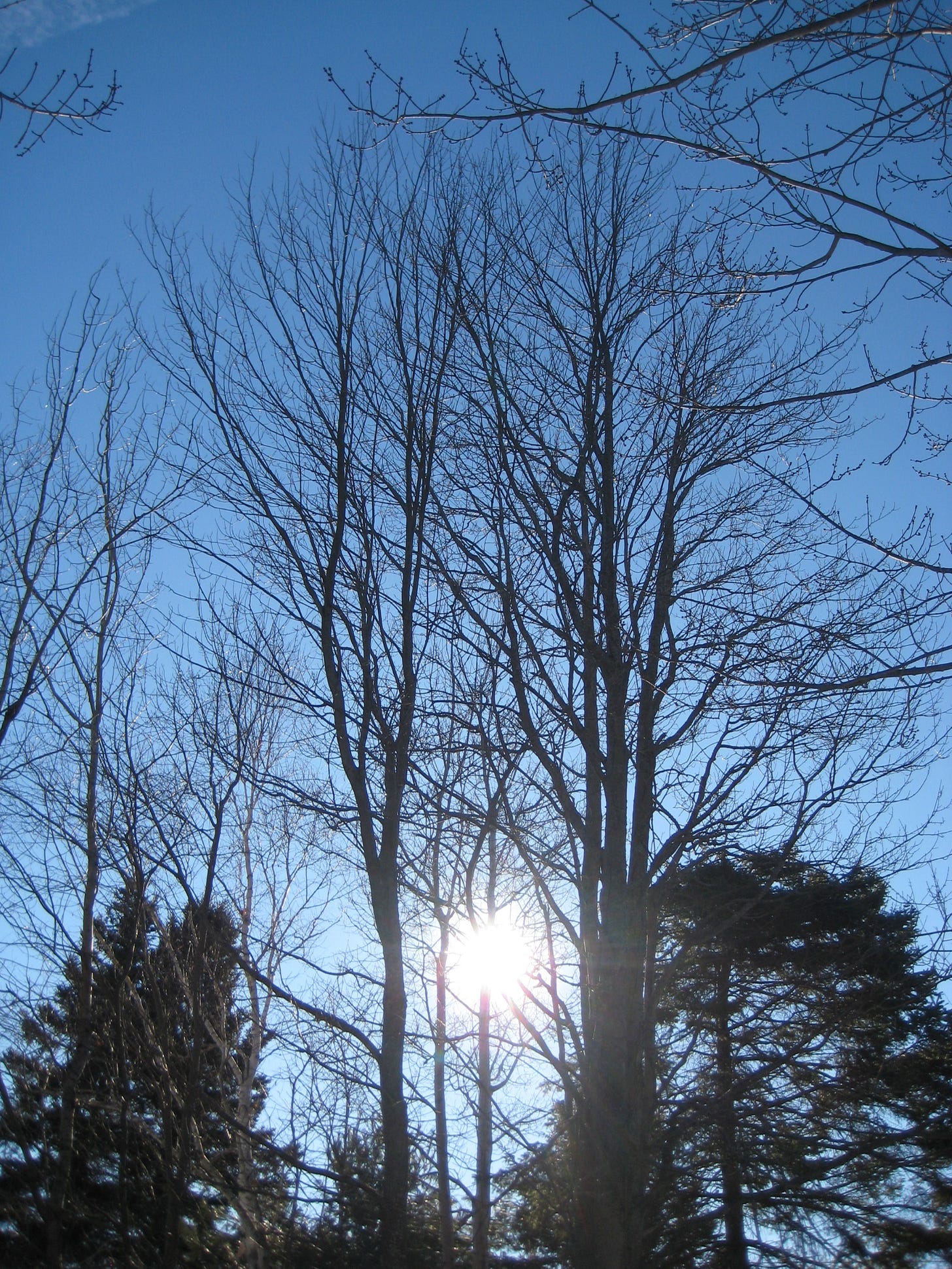 The morning Sun burned through the partial eclipse attempted by the sugar maples. Perhaps they were too warm and sweet to succeed. They would have to become cold and hard like the Moon to block out all that light. Nonetheless, their spider web of limbs and branches, though naked, sufficed to protect my eyes, something that the Moon, in its solemn solidity could not do